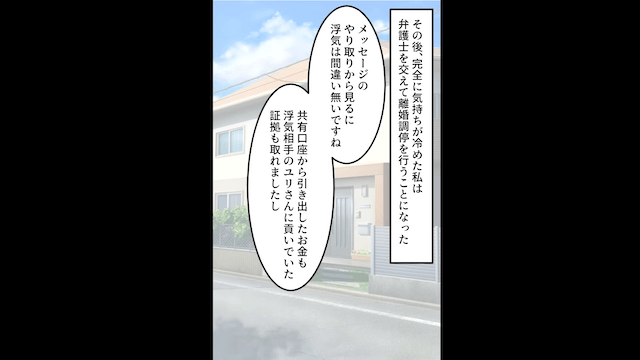夫を尾行した主人公は浮気の事実を突き止め、気持ちが冷めてその場で夫に離婚を突きつけました。 その後の離婚調停では、夫の浮気や女性に貢いでいた証拠が次々と明らかになっていき…。