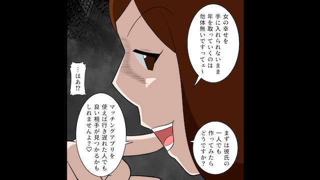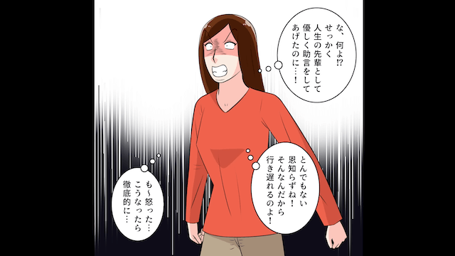 主人公を見下すような発言をした挙句「まずは彼氏の1人でも作ってみたらどうですか?」と上から目線でアドバイスをしてきた弟嫁。 主人公がそんな弟嫁に激怒して立ち去ると、弟嫁は「せっかく人生の先輩として優しく助言をしてあげたのに…!」と腹を立てて…。