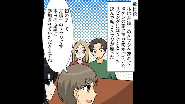 主人公は弁護士に連絡して離婚の手続きを進め、夫に財産分与の話し合いを提案しました。 そして数日後、主人公は弁護士を連れて夫と女性のもとへ向かいます。