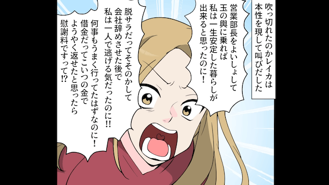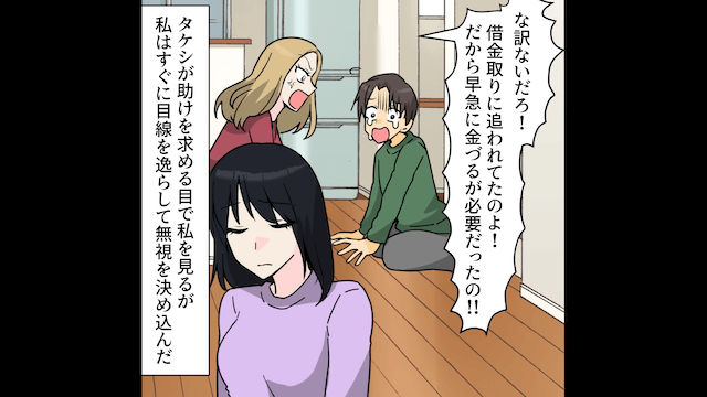 主人公は女性が夫の同僚の手柄を横取りし、借金もしていることを暴露しました。 すると女性は本性を現し、夫を金づるにして逃げるつもりだったと自白したのです。