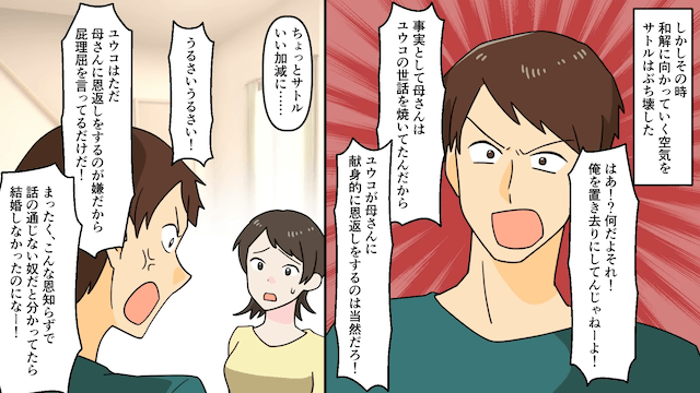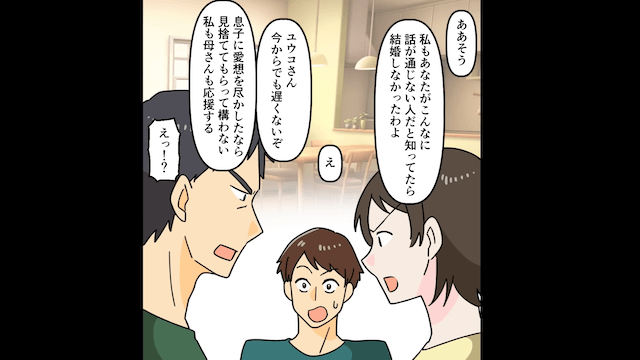 義父が主人公の味方をしたことで、夫と義母は「秘密の関係があるとか…?」と疑いますが、義父に激怒されて義母は主人公に謝罪しました。 それでも夫は納得せず「こんな恩知らずで話の通じないやつだとわかってたら結婚しなかったのにな!」と主人公に言い放ち、主人公は離婚に向けて動き出します。