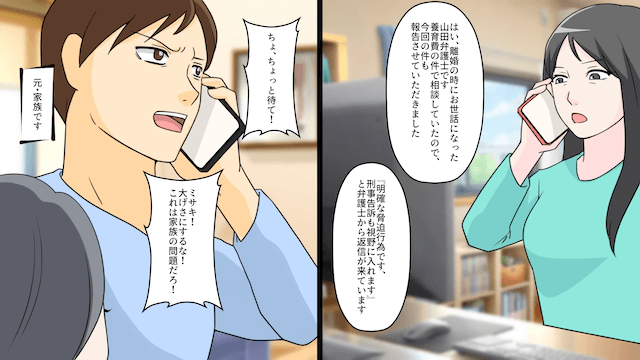 元夫からの養育費が2ヶ月間、数日遅れて振り込まれるため、主人公は弁護士に相談していました。 また、元義母の口座が養育費の支払いが滞り始めた時期に開設されていたため、主人公は「養育費を別口座に移し私に払わないつもりだったんですか?」と元義母に問いかけます。
