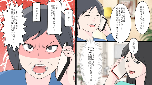 すると元義母は「今すぐ100万円を振り込みなさい!」と言い、明らかな脅迫行為をしてきて…。