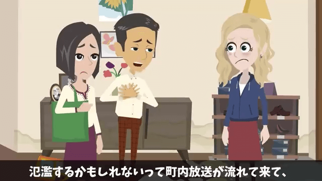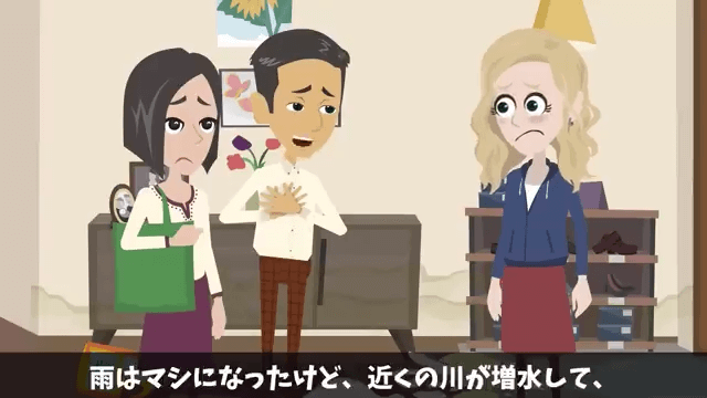 数時間後、義実家に到着した主人公は「用意はできましたか!?」と義両親に尋ねます。 すると義父は「できてるよ」と答え、近くの川が氾濫するかもしれないと聞いて怖かったと主人公に話しました。