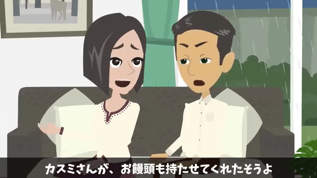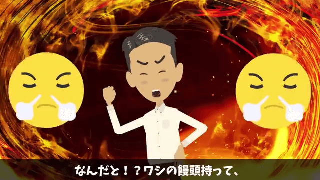 義母は、主人公が夫に手土産として饅頭を持たせていたことを義父に伝えます。 それを聞いた義父は「なんだと!?ワシの饅頭持って、どこをほっつき歩いてるんだ!?」と怒りました。