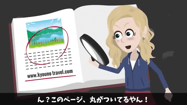 主人公は旅行雑誌のページに丸がついていることに気づき、ここが夫の旅行先だと確信します。 そこで主人公は夫のパソコンの履歴を見てみることにしました。