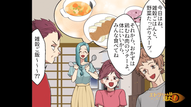 主人公は家族4人で笑いあいながら食事をしたいと願い、父の不健康な体も心配していました。 そこで主人公は母に食事改善を頼み、健康的な料理を作ってもらいます。