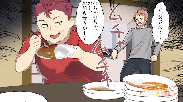 父にカロリーの高い食事を用意してお酒を勧める母に違和感を抱いた主人公。 それから1週間後、主人公が朝起きてリビングへ行くと、大量のカレーを食べている父がいました。