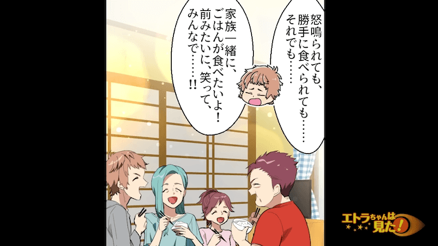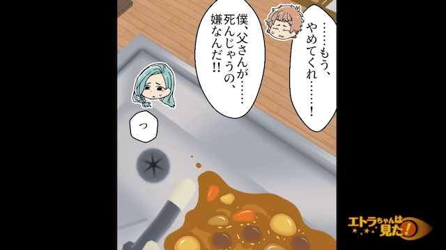 そして大量のカレーを捨てた主人公は、母に「父さんが死んじゃうの嫌なんだ!家族一緒にご飯が食べたいよ!」と訴えました。