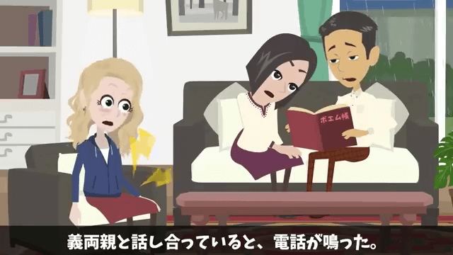 主人公は夫の浮気の証拠として、ポエム帳を義両親に渡しました。 そして主人公が義両親と話し合っていると、夫から電話がかかってきたのです。