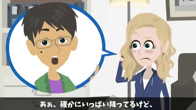 主人公は義実家が豪雨で大変そうだから心配して電話したと夫に伝えます。 すると夫は「あぁ、確かにいっぱい降ってるけど、なんともないさ」と答えました。