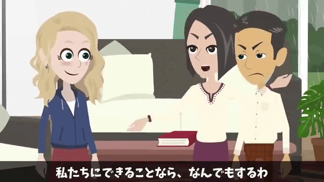 主人公は義両親に「ちょっと、協力してもらっていいですか?」とお願いしました。 すると義母は「私たちにできることなら、なんでもするわ」と答え、それから一夜が明けたのです。
