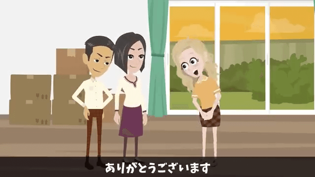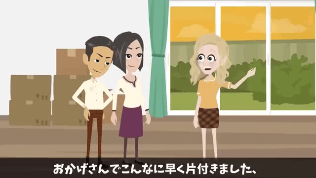 主人公は義両親に手伝ってもらい、急いで引っ越しの準備を進めます。 そして夕方、主人公は「おかげさんでこんなに早く片づきました、ありがとうございます」と義両親にお礼を言いました。