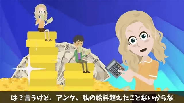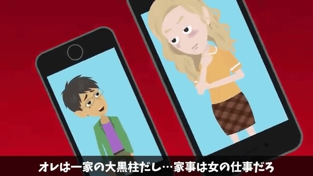 夫は自分が一家の大黒柱であり、家事は女性の仕事だと言います。 それを聞いた主人公は、夫の給料が主人公の給料よりも多くないことを明かしました。