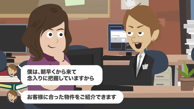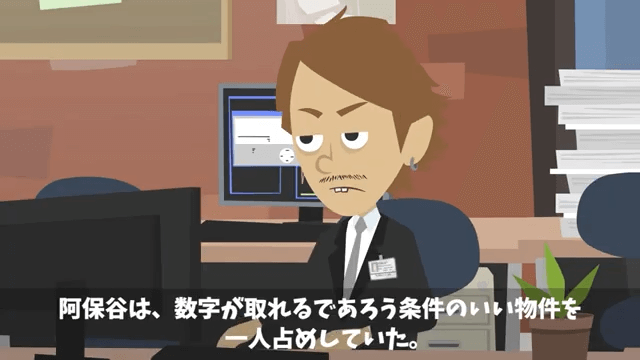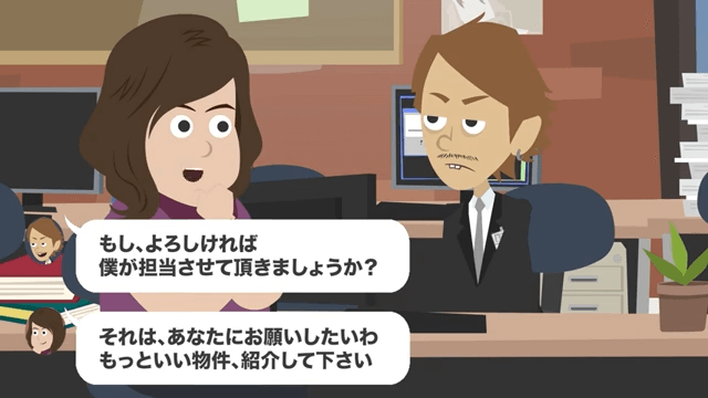 社長の息子が「もしよろしければ僕が担当させていただきましょうか?」と客に申し出ると、客は「あなたにお願いしたいわ。もっといい物件、紹介して下さい」と言いました。 こうして社長の息子は、主人公の客を奪い…。