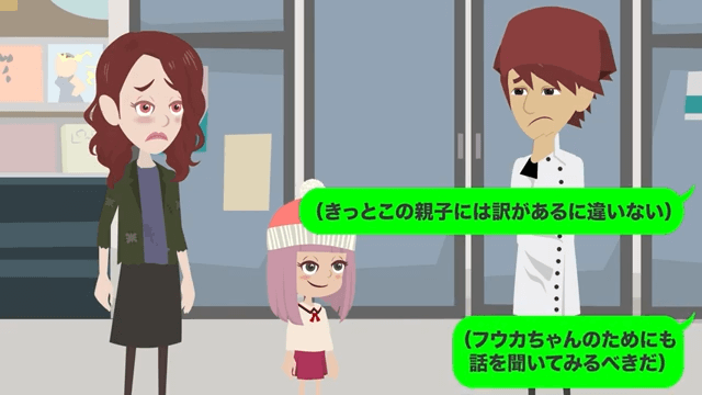 主人公は女の子たちには訳があるに違いないと考えます。 そして開店まであと20分あったため、主人公は女の子とその母にとんかつを食べてもらうことにしました。
