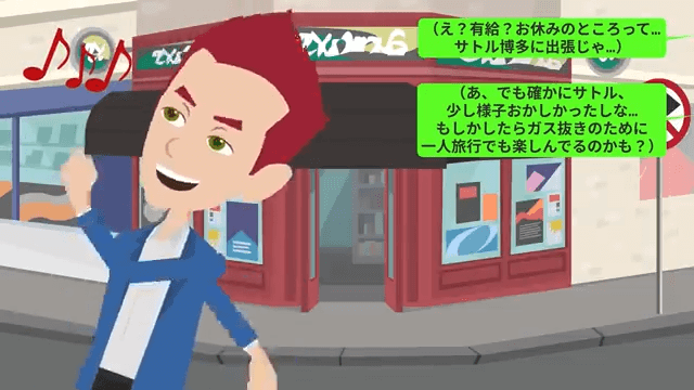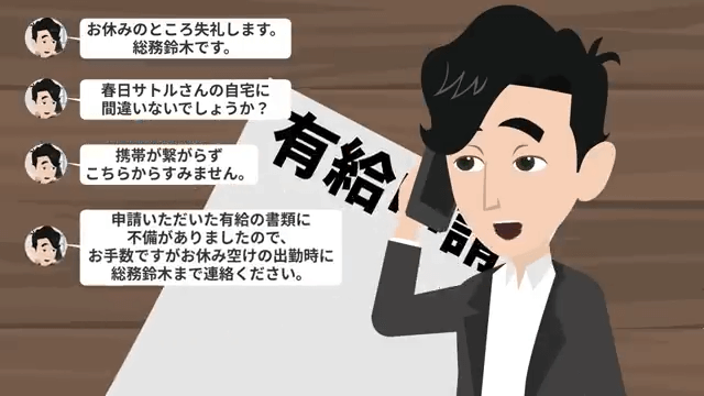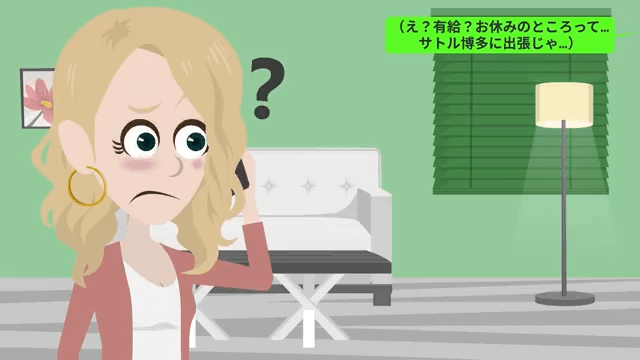主人公は夫の会社からの連絡で、夫が有給を取っていたことを知ります。 そこで主人公は、夫が息抜きのために旅行を楽しんでいるのかもしれないと考えました。