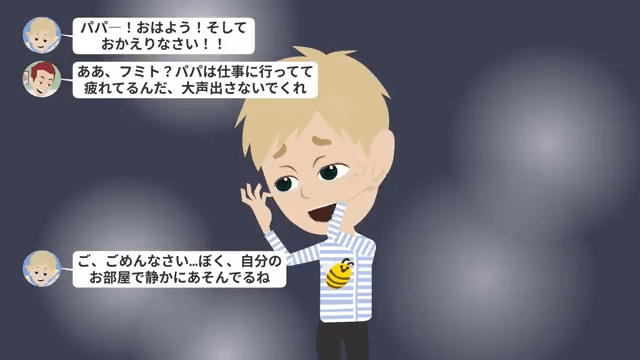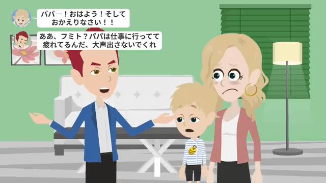 息子は夫に「パパー!おはよう!そしておかえりなさい!」と言いました。 それに対し夫は「パパは仕事に行ってて疲れてるんだ、大声出さないでくれ」と冷たく対応します。