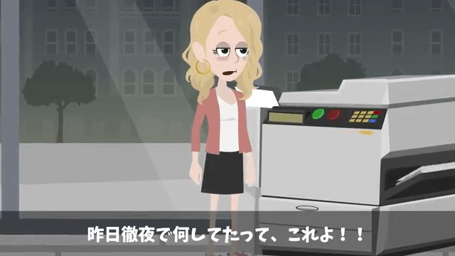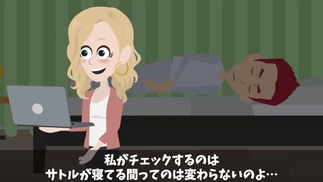 主人公は夫が寝ている間に、浮気相手とのやりとりをチェックして、さらにそれを印刷します。 しかしなかなか手間がかかる作業のため、主人公は徹夜でこれを繰り返していました。