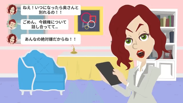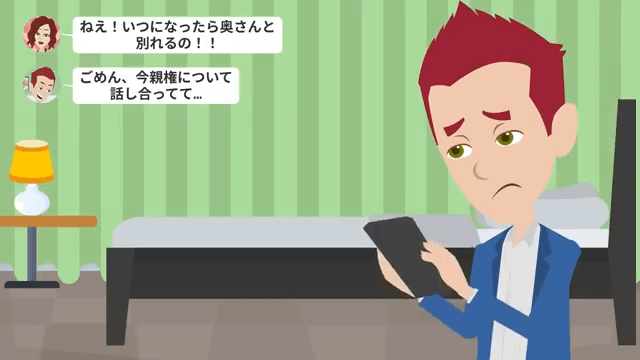 浮気相手は夫に「ねえ!いつになったら奥さんと別れるの!」と尋ねます。 それに対し夫は「ごめん、今親権について話し合ってて…」と答えました。