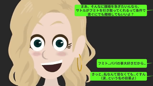 主人公は夫が息子を引き取ってくれるのなら、すぐに離婚してもいいと言います。 さらに主人公は、今の自分が息子を引き取っても息子を幸せにできないと話し、嘘の涙を流して…。