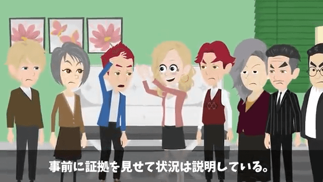 主人公が声をかけると、家の中のあらゆる場所から親族や知り合いが続々と出てきました。 実は主人公は事前に皆に夫の浮気の証拠を見せ、状況を説明していたのです。