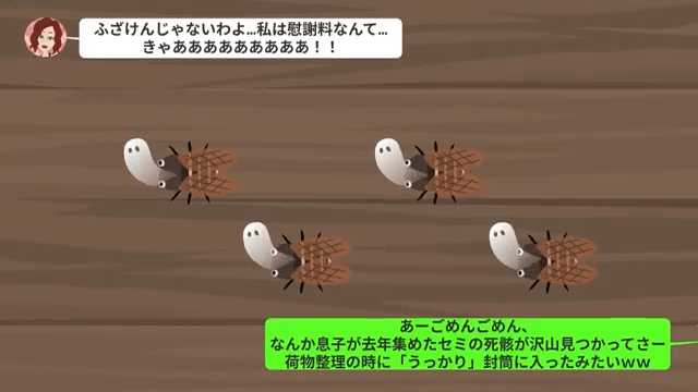 主人公は「送った封筒の中身、さっさと確認してくれない?」と浮気相手に伝えます。 すると、その中にはセミの死骸が入っており、浮気相手は悲鳴を上げました。