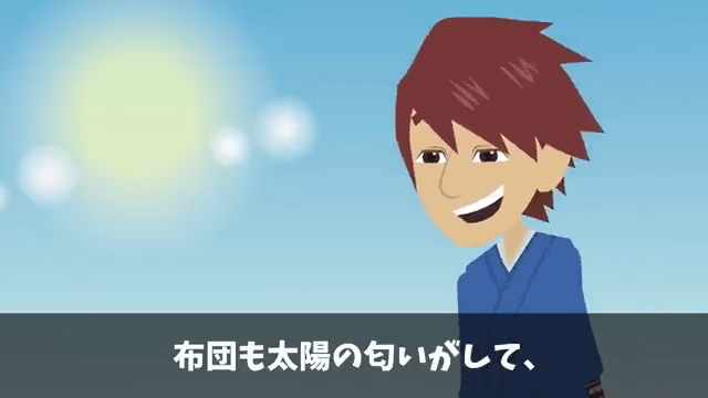 温かいお風呂で体の疲れを癒やした主人公たちは、民宿で楽しい時間を過ごします。 布団は太陽の匂いがして、主人公たちは心からくつろいで休むことができました。