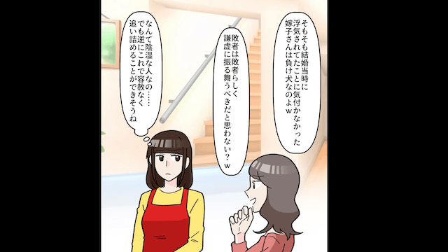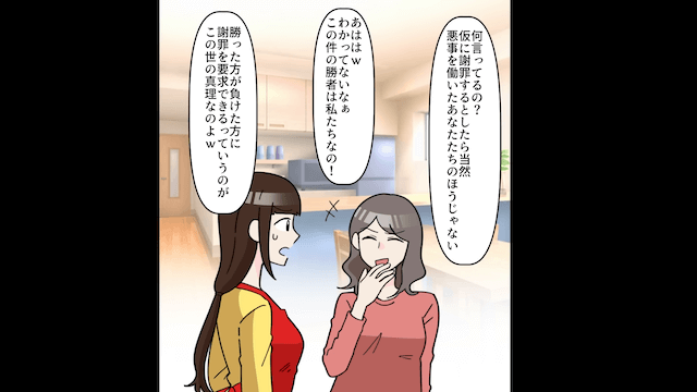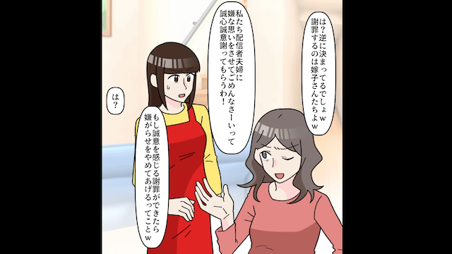主人公と夫が反撃の準備を整えていると、突然女性が家にやってきます。 女性は主人公に「あなたに謝罪の場を与えてあげようと思ってるの!」と言い出し、自信満々な態度をとりました。