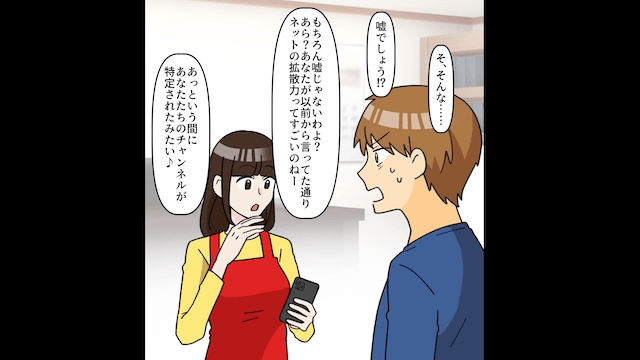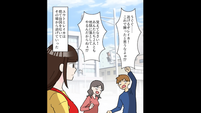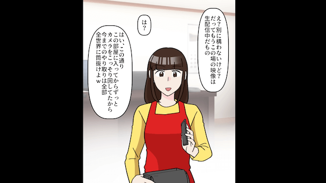 追い詰められた元夫は嫌がらせを認めたうえで「この現場を全世界に配信してやる!」と主人公を脅しました。 しかし実は主人公がすでに配信していて、不利な状況に陥った元夫と女性はその場から逃げたのです。