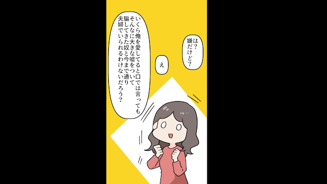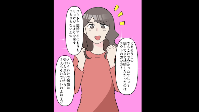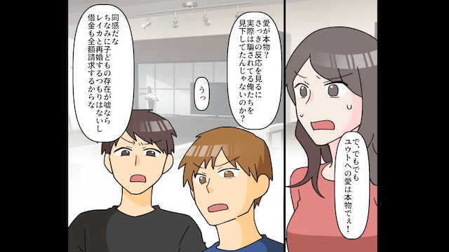 男性は「そのお腹の子は俺との間の子なんだろ?」と女性に尋ね、借金を全額返済するか復縁するかの選択を女性に迫ります。 すると女性は開き直って妊娠は嘘だと暴露し、元夫と離婚するつもりはないと言いました。