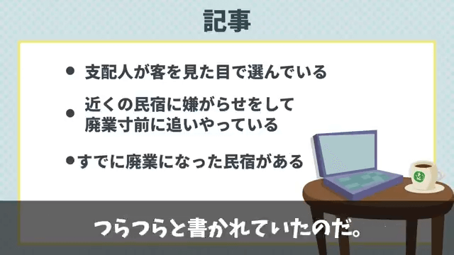 今回は『結婚記念日に高級旅館の支配人に追い出された話』を紹介します。 オーナーから「この記事を読んでみろ!」と言われた支配人はその場で記事を読み始めました。 するとそこには、支配人が見た目で客を選んでいることが書かれており…。