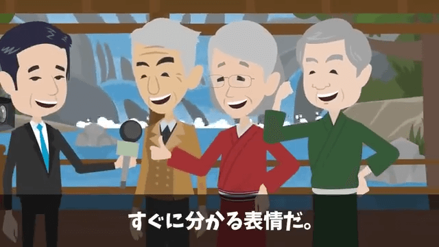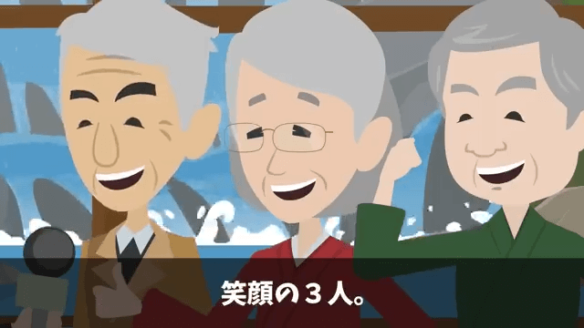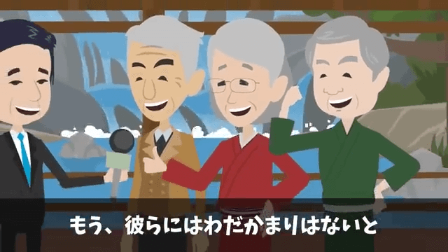 ある日、主人公たちがテレビを見ていると、民宿の夫婦と高級旅館のオーナーが映っていました。 3人とも明るい笑顔で、もうわだかまりはないとすぐにわかる表情でした。