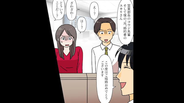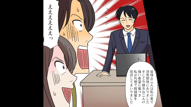 今回は『俺の上司の名前を婚姻届に書いた浮気妻の末路』を紹介します。 彼女と上司に委任状のサインをもらい、2人の婚姻届を役所に提出した主人公。 その後、主人公は会社の合同会議で「私から皆様にご報告したいことがございます」と言い…。