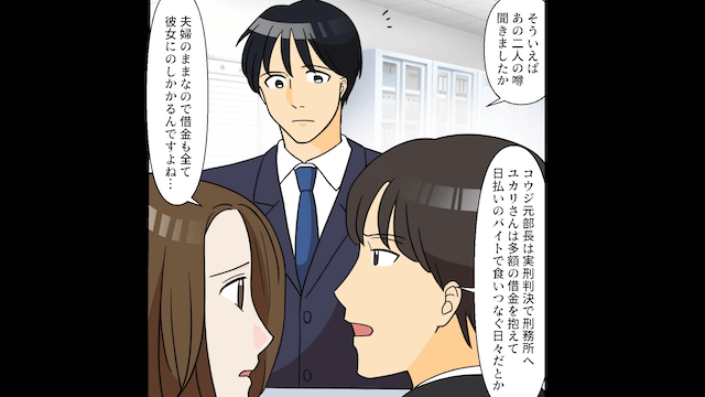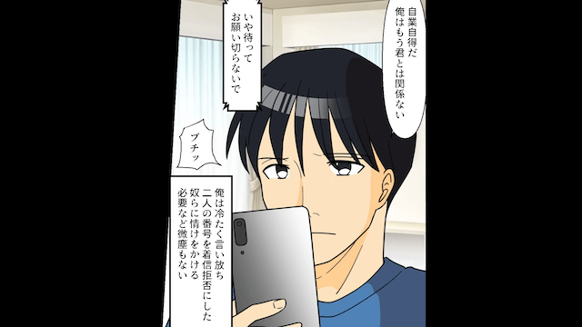 最後の反撃として、会社からの損害賠償請求を彼女に送り、彼女にだまされた被害者として集団訴訟をすることにした主人公。 追い詰められた彼女と上司は主人公に助けを求めてきますが、主人公はそんな2人を冷たく突き放します。