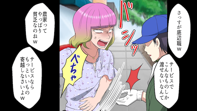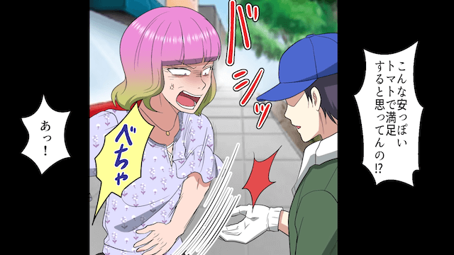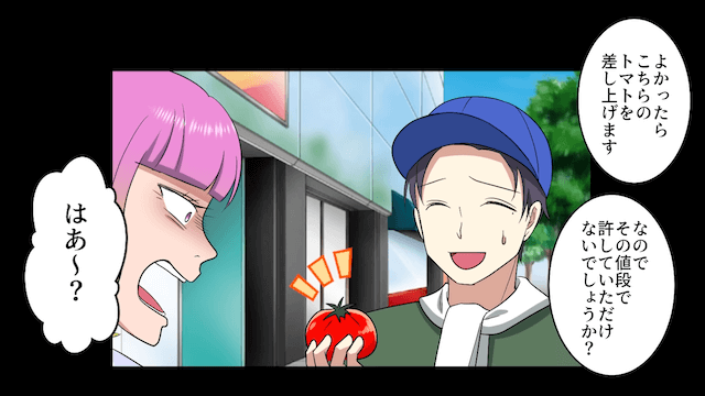 主人公は女性に声をかけて他のトマトをサービスとして差し出すのですが、女性はトマトをはたき落とした挙句、農家をバカにして…。