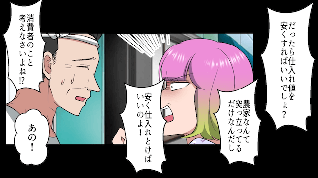 主人公が八百屋に野菜を納品しに行ったときのことです。 店員に「こんな小さいトマトを店頭に並べるなんて恥ずかしくないわけ!?」と文句を言い、値引きを要求している女性がいました。
