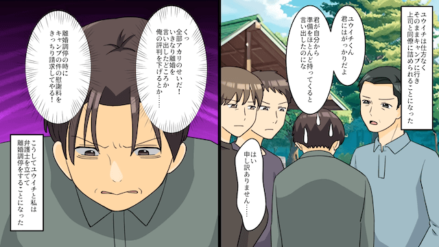 ことの重大さを理解していない夫は主人公に電話をかけ、主人公を責めました。 しかし主人公は夫に離婚を突きつけ、キャンプの準備もしていないと告げたのです。