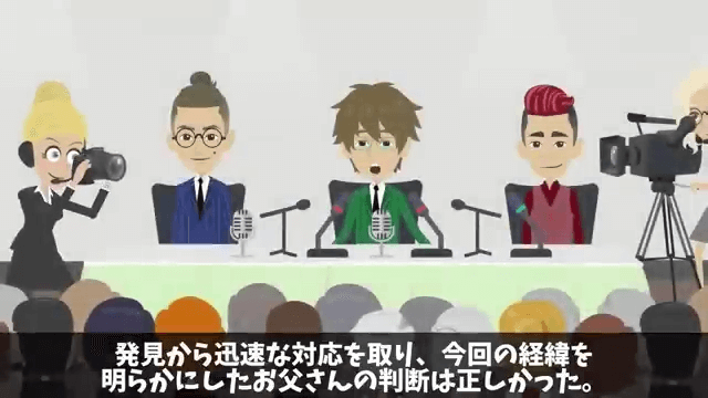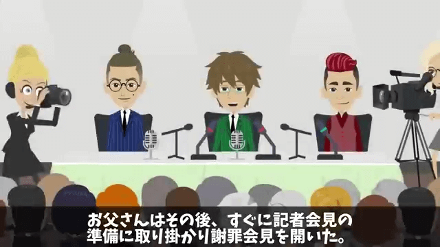 父から「黙って今後の発表を待つことだ」と言われた教授の父はショックで気絶してしまいます。 その後、父はすぐに謝罪会見を開き、今回の経緯を明らかにしました。