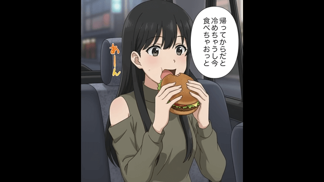 新作が出ていることを思い出し、ハンバーガーを買った主人公。 そして主人公がタクシーの中でハンバーガーを食べようとすると…。