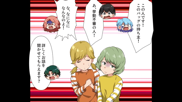 警備員が主人公から話を聞いていると、男子学生たちが怪しいのは主人公ではなく友人だと言いました。 するとそこに友人が戻ってきたため、警備員は「詳しくお話を聞かせてもらえます?」と声をかけます。