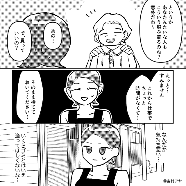 主人公が困惑していると、ゴミを漁っていたのは隣人だと判明。 隣人は分別の確認をしていたようで、主人公のゴミも漁り始め、捨てようとしていた服を見て「もらっていいかしら?」と言ってきました。