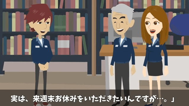 主人公は建設会社で現場監督として働いています。 そして仕事が終わってから、主人公は「来週末お休みをいただきたいんですが…」と上司にお願いしました。