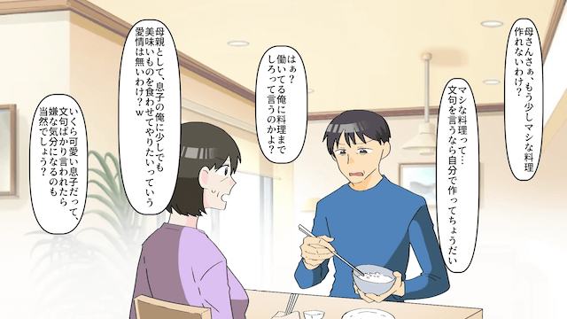 今回は『息子夫婦が「親はATM(笑)」と見下してきた話』を紹介します。 夫が単身赴任中のため、40歳の息子と2人で暮らしている主人公。 息子は生まれてから一度も家を出たことがなく、自分勝手でわがままな性格で…。