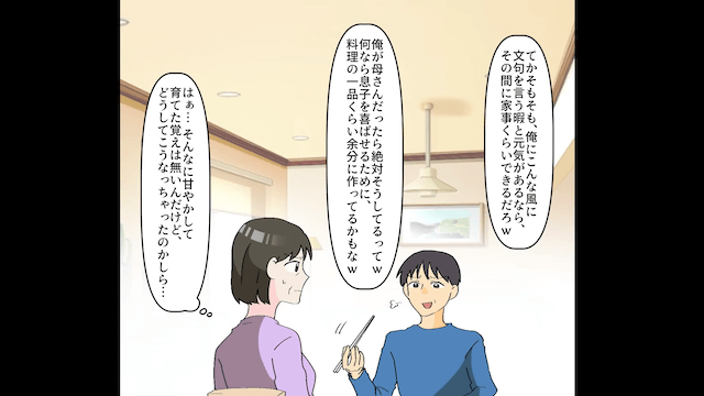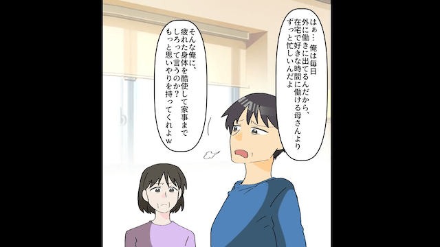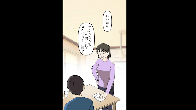 息子は家事をしないにもかかわらず、家事と仕事を両立している主人公に文句ばかり言ってきました。 そんな息子の偉そうな態度に呆れた主人公は、息子にスケジュール帳を見せて…。