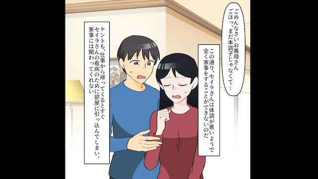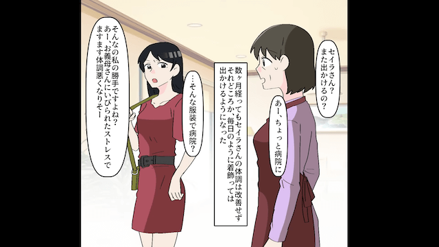 息子だけでなく、体が弱い息子の妻も一切家事をしないため、負担が増えてしまった主人公。 数ヶ月が経っても息子の妻の体調は改善せず、それどころか毎日着飾って出かけるようになり…。