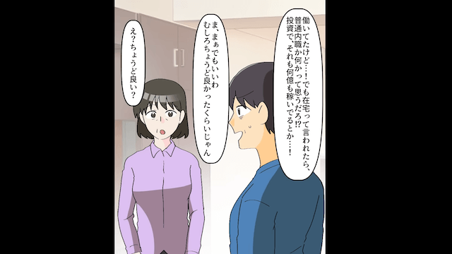 今回は『息子夫婦が「親はATM(笑)」と見下してきた話』を紹介します。 主人公が投資で莫大な利益を出していたことを知って、驚愕する息子。 主人公はそんな息子に「私、いつも日中働いてたでしょ?」と言い…。