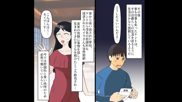 家から追い出され、コネで働いていた会社も辞めるよう告げられた息子は、苦しい生活を送るはめになり、息子の妻も同じように困窮しているようです。 一方、主人公夫婦は新居で幸せに暮らしたのでした。
