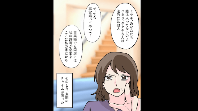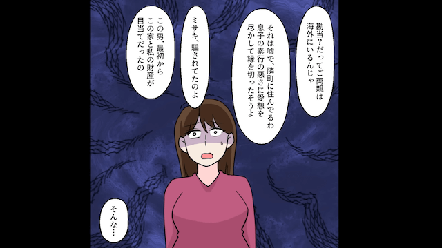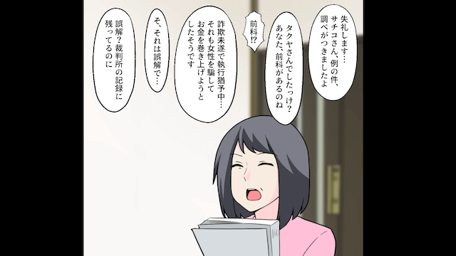 娘婿が2週間前から会社を無断欠勤していたことや、婚姻届を提出していなかったことを明かした主人公。 さらにちょうど家にやってきた隣人によって、娘婿が詐欺罪の執行猶予中で、親から勘当されていたことが判明し…。