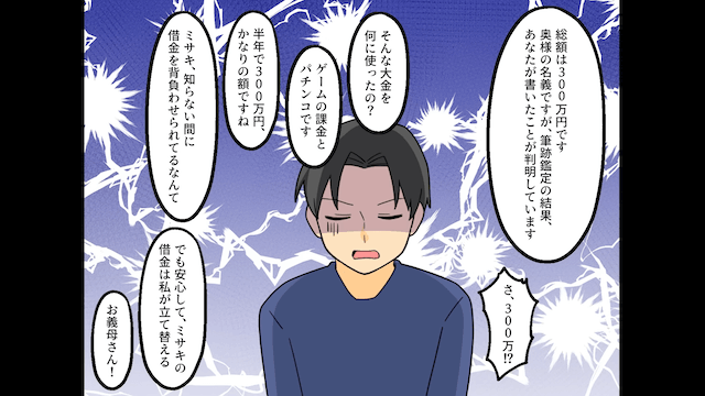 衝撃の事実を知って体調を崩した娘は救急搬送されますが、娘婿は病院にも来ず逃げようとしました。 しかし逃げた先で債権回収人に捕まり、娘婿が娘名義で300万円の借金をしていたことが発覚。